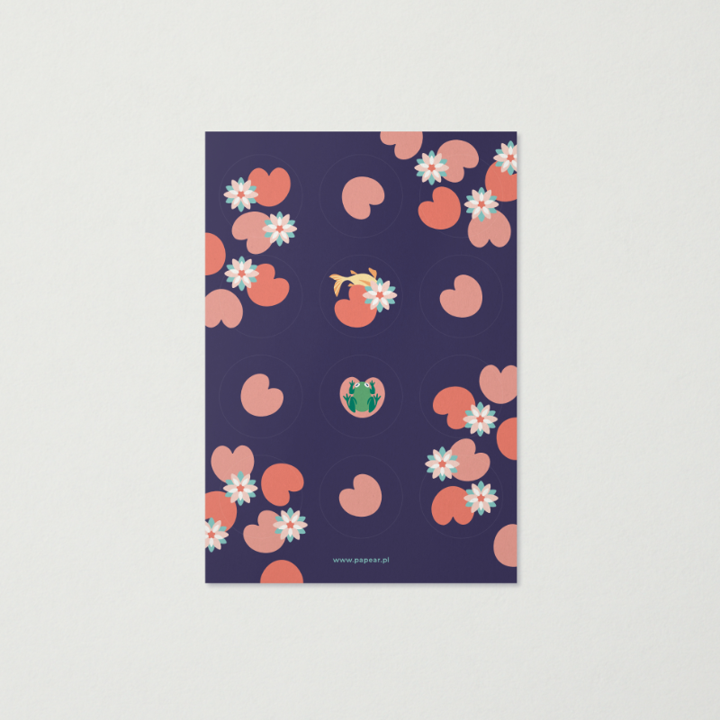 Zestaw 12 uroczych, papierowych, kolorowych naklejek z motywem nenufarów, żaby i złotej rybki. Idealne do zaklejenia koperty czy ozdobienia notesu lub paczki z prezentem. Wysoka jakość wydruku i piękny, włoski, matowy papier bezdrzewny zadowolą każdego miłośnika papierniczych drobiazgów. Naklejki mają format pocztówki, dzięki czemu sprawdzą się także jako dodatek do upominku.