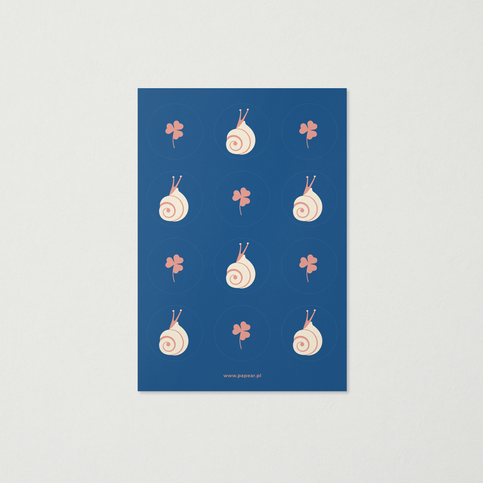 Zestaw 12 papierowych, kolorowych naklejek z motywem ślimaków i listków koniczyny. Idealne do zaklejenia koperty czy ozdobienia notesu lub paczki z prezentem. Wysoka jakość wydruku i piękny, włoski, matowy papier bezdrzewny zadowolą każdego miłośnika papierniczych drobiazgów. Naklejki mają format pocztówki, dzięki czemu sprawdzą się także jako dodatek do upominku.