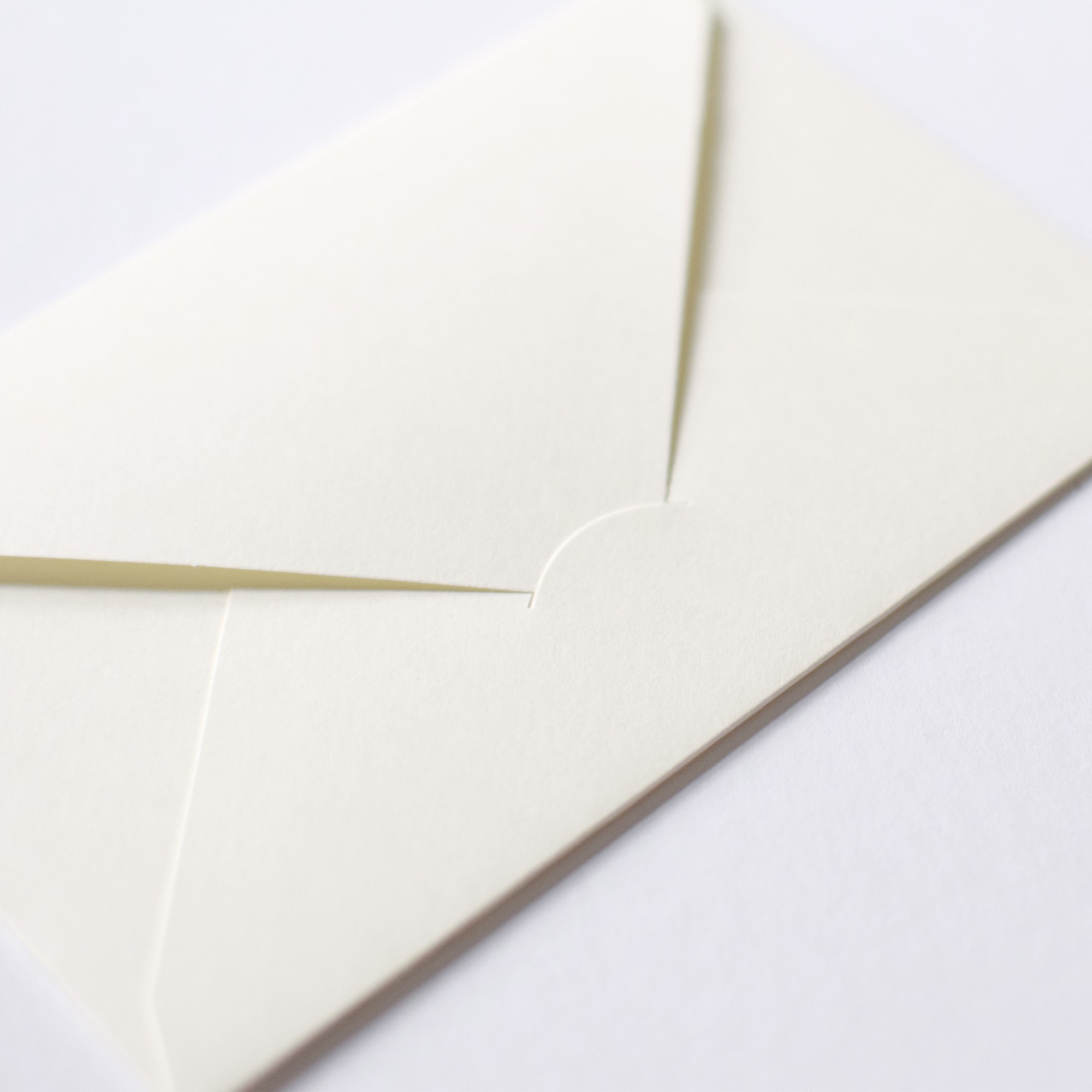 W odcieniu kości słoniowej. Ręcznie klejona, wyściełana wewnątrz. Posiada dyskretne tłoczenie z logo marki oraz nacięcie do zamknięcia. Wymiar 145 x 97 mm.
