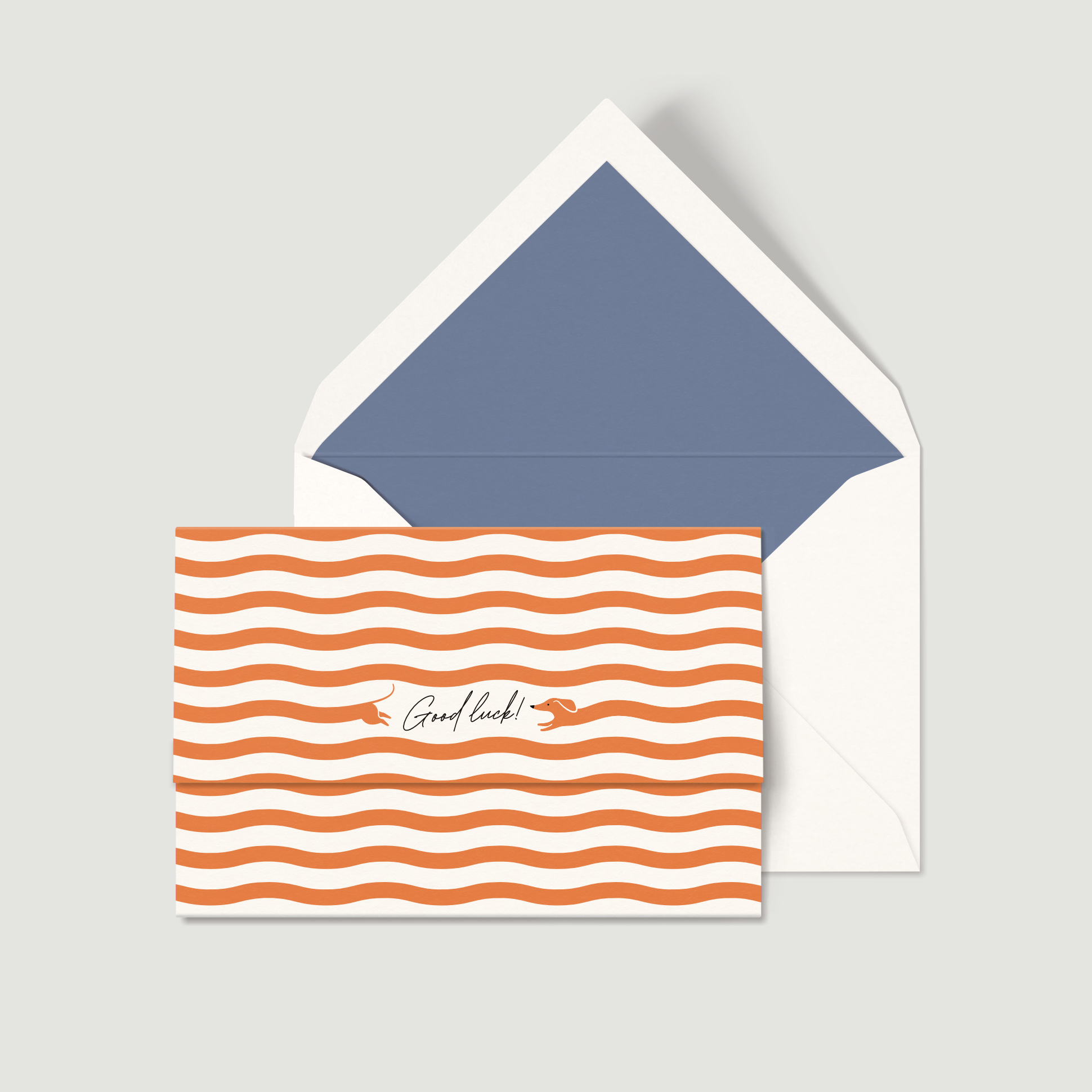 Kartka okolicznościowa z zabawnym motywem jamnika goniącego własny ogon i przewrotnym życzeniem 'powodzenia'. Dla każdego z poczuciem humoru ale i doceniającego kunsztowny dizajn. Na różne okazje jak i bez okazji! We wnętrzu kartki znajduje się drobny motyw śpiącego jamnika i mnóstwo miejsca na Wasze życzenia. W zestawie znajduje się także zadrukowana wewnątrz koperta.